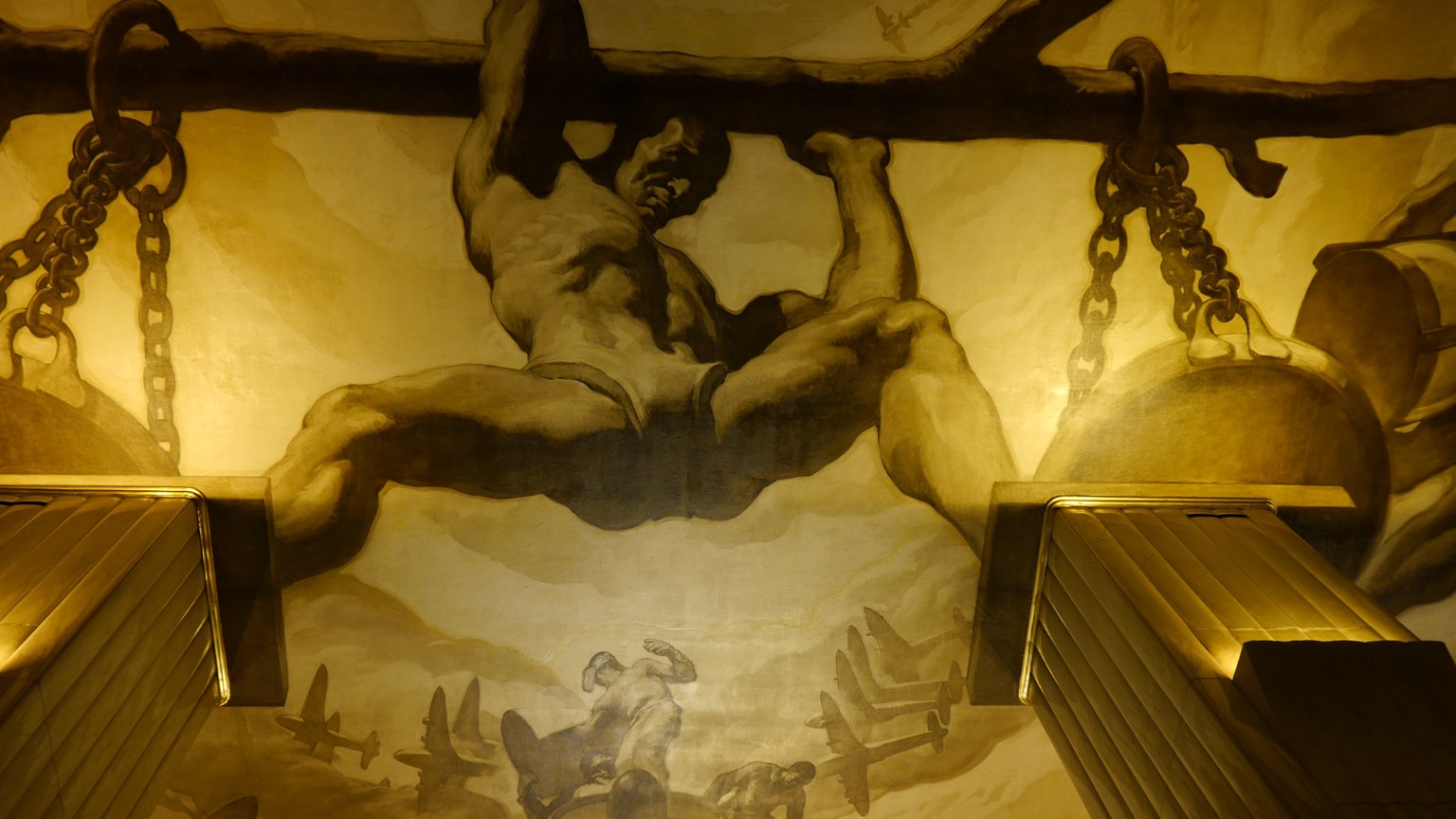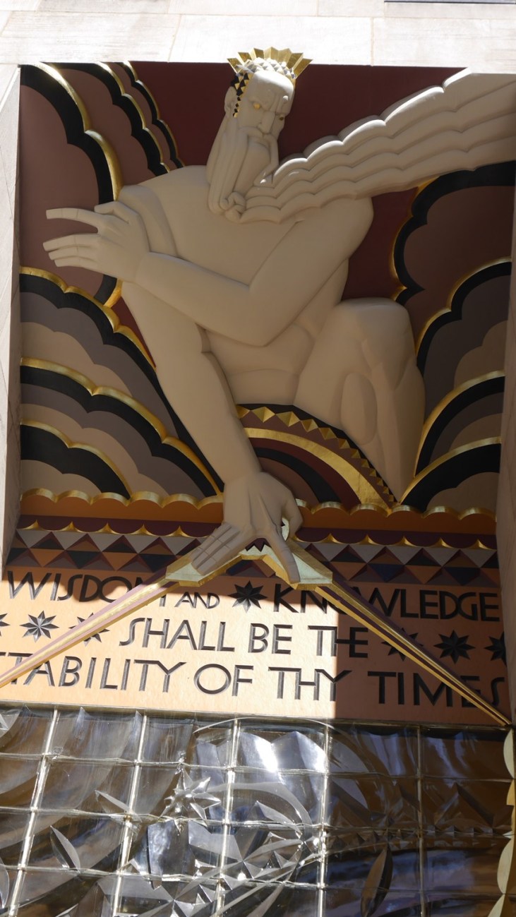 This is the grand mural that greets you when you walk in the Rockefeller Center. It is called American Progress but it replaced the more controversial original painting by Diego Rivera which was destroyed at the orders of Nelson Rockefeller because it featured a picture of Lenin (Rivera was a communist). Rivera got his revenge when he repainted the picture in Mexico and featured Nelson Rockefeller’s teetotal father, John D. Rockefeller Jr, drunk with a woman in a nightclub under a container of syphilis bacteria.