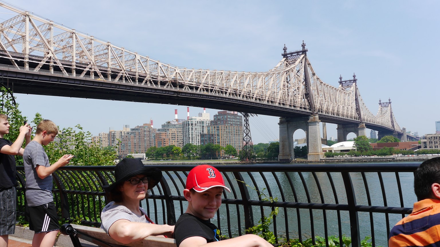 The Queensboro Bridge. You would know it from Woody Allen’s Manhattan or by its other name The 59th St Bridge as immortalised in the Simon and Garfunkel song Feelin’ Groovy. Hello lamp post watcha knowin’? Michelle and Harrie are sitting on the same seat that Woody Allen and Diane Keaton sat (see the next picture).