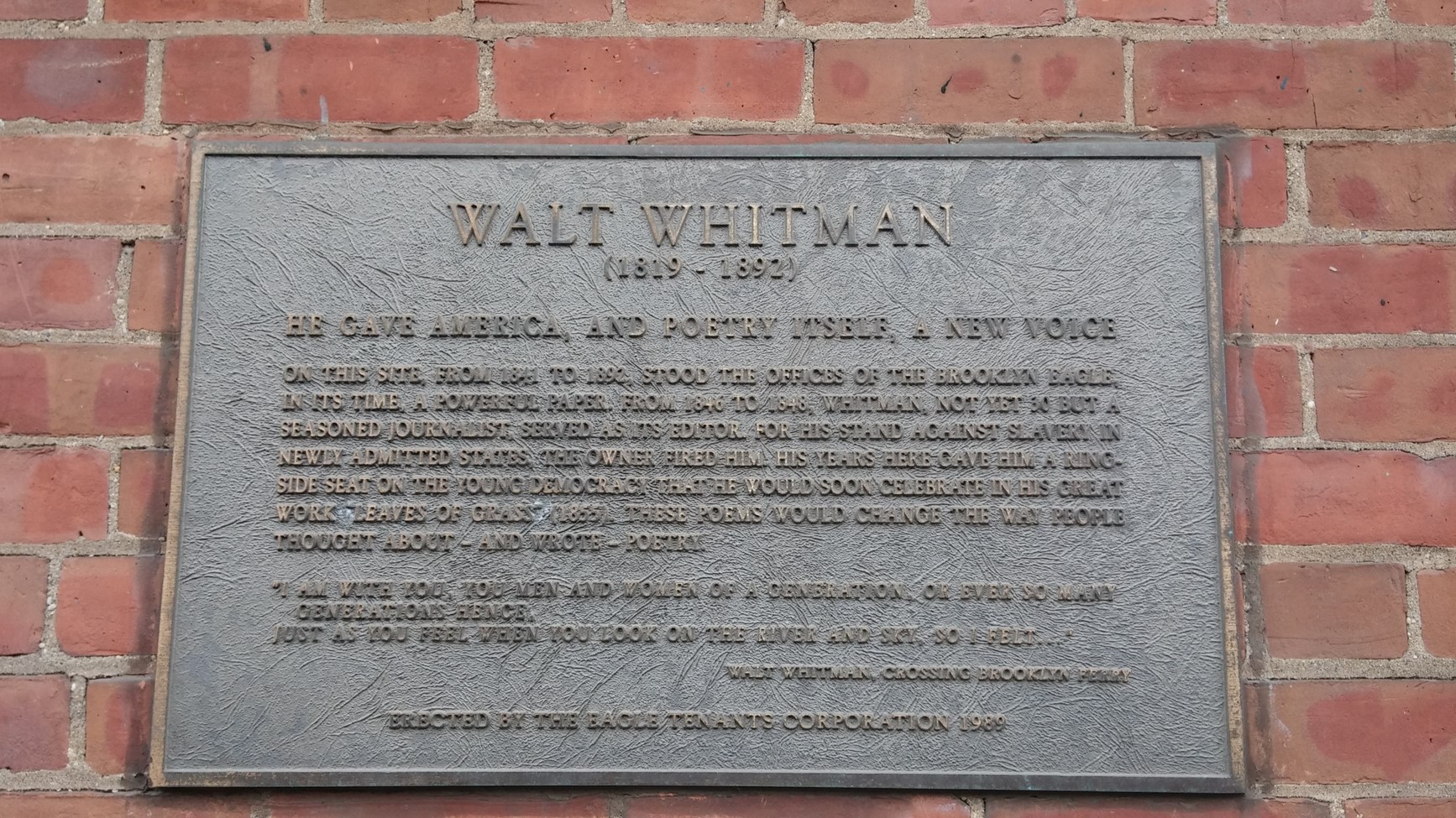 New York’s greatest poet, Walt Whitman. “But I was Manhattanese, friendly and proud! I was call’d by my nighest name by clear loud voices of young men as they saw me approaching or passing, Felt their arms on my neck as I stood, or the negligent leaning of their flesh against me as I sat, Saw many I loved in the street, or ferry-boat, or public assembly, yet never told them a word, Lived the same life with the rest, the same old laughing, gnawing, sleeping, Play’d the part that still looks back on the actor or actress, The same old role, the role that is what we make it, as great as we like, Or as small as we like, or both great and small.” From Crossing Brooklyn Ferry, Leaves of Grass.