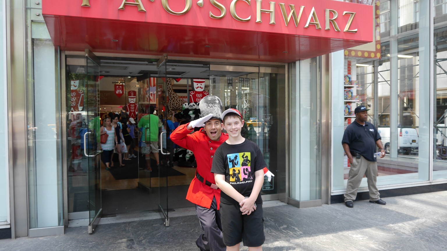 FAO Schwarz have their own toy soldier guarding the entrance. Except that he is not a toy or a soldier.