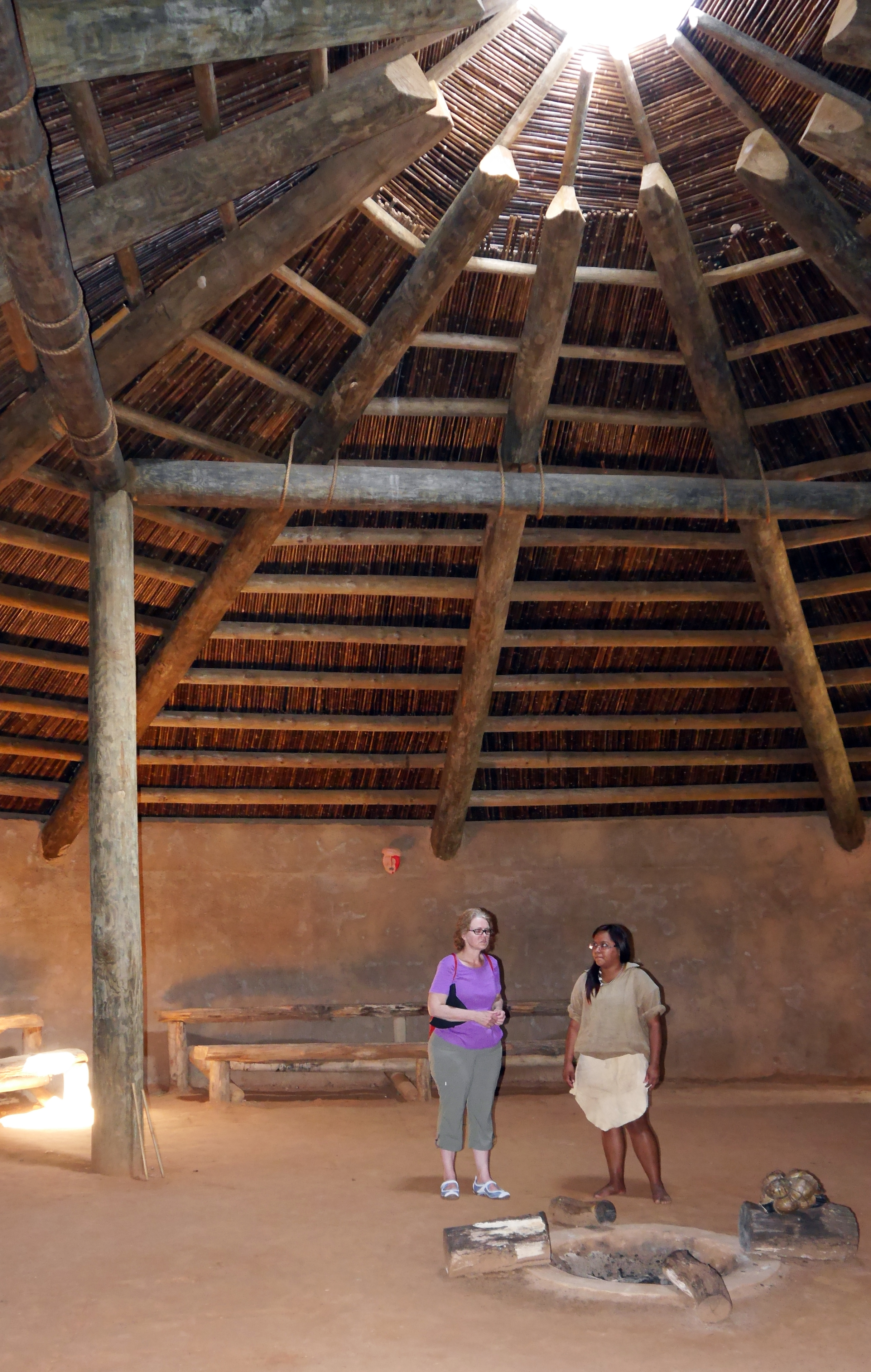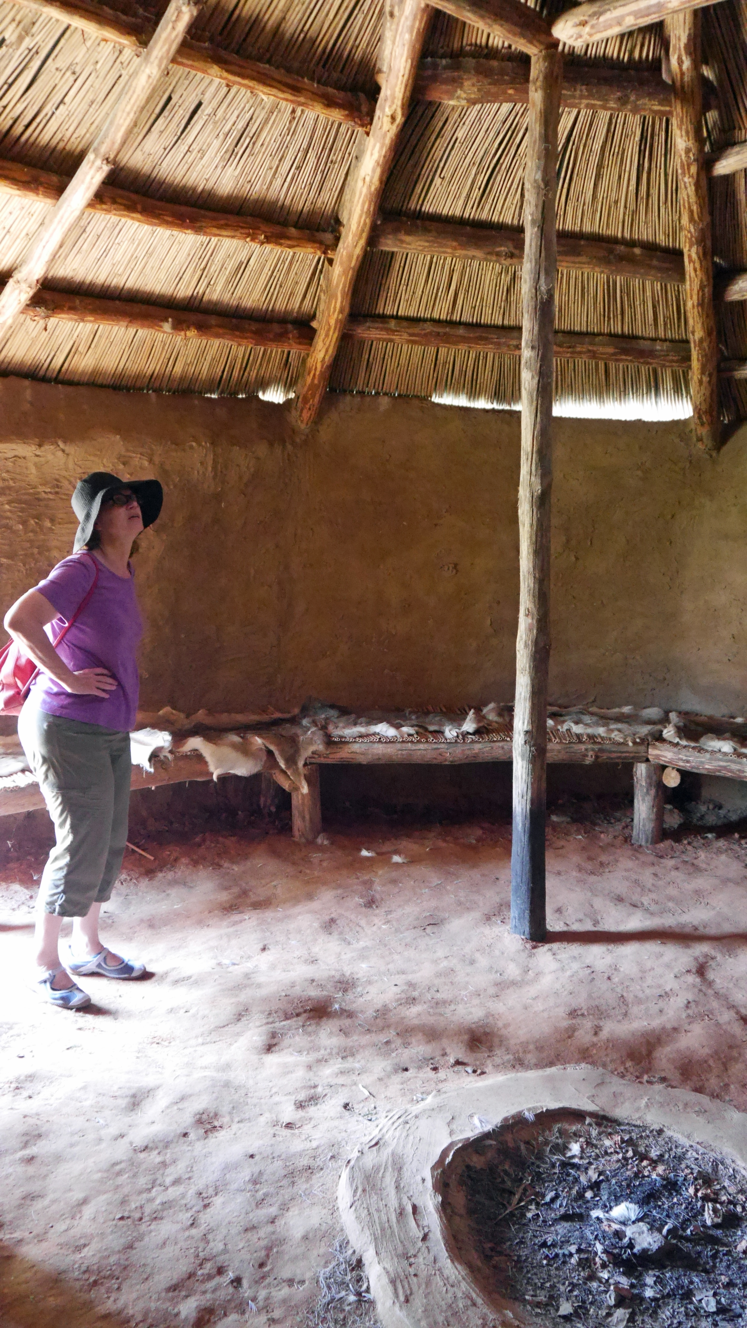 Inside a Cherokee house. It is a myth that all American Indians lived in teepees. Only the nomadic Plains Indians lived in teepees, the rest lived in mud and clay huts such as this. The roof is made of brush and river cane.