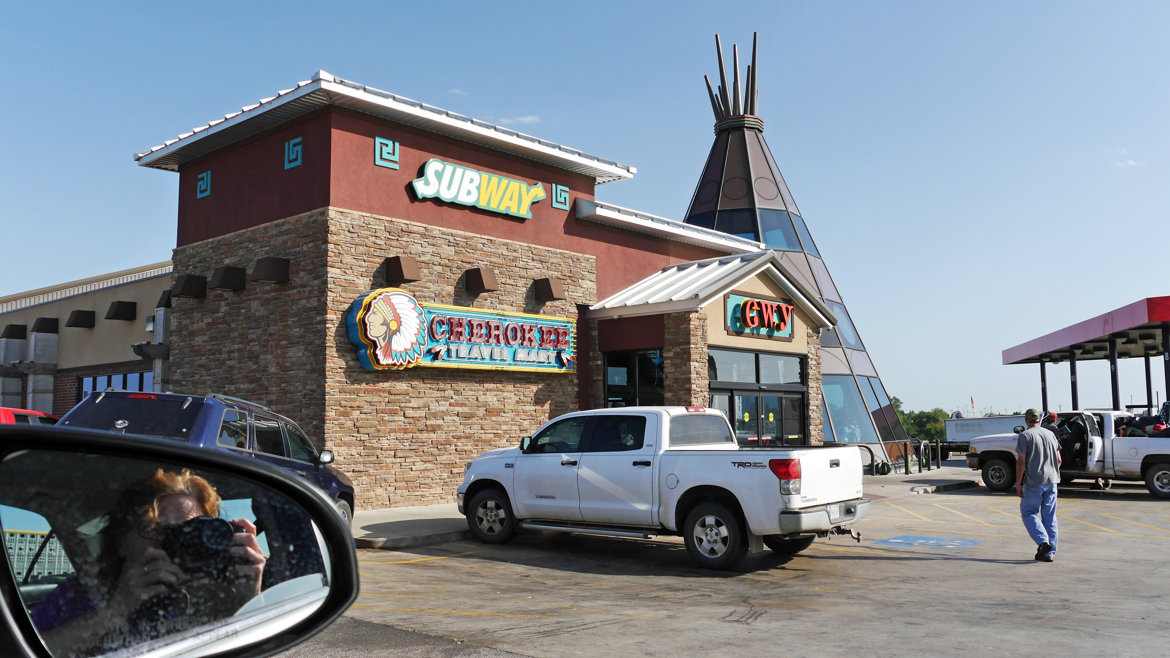 Here is an Indian trading post that we called in for petrol a few miles out of Oklahoma city. No wampum here, just credit cards and cash please. Bonus points for spotting Michelle doing an Alfred Hitchcock in the foreground.