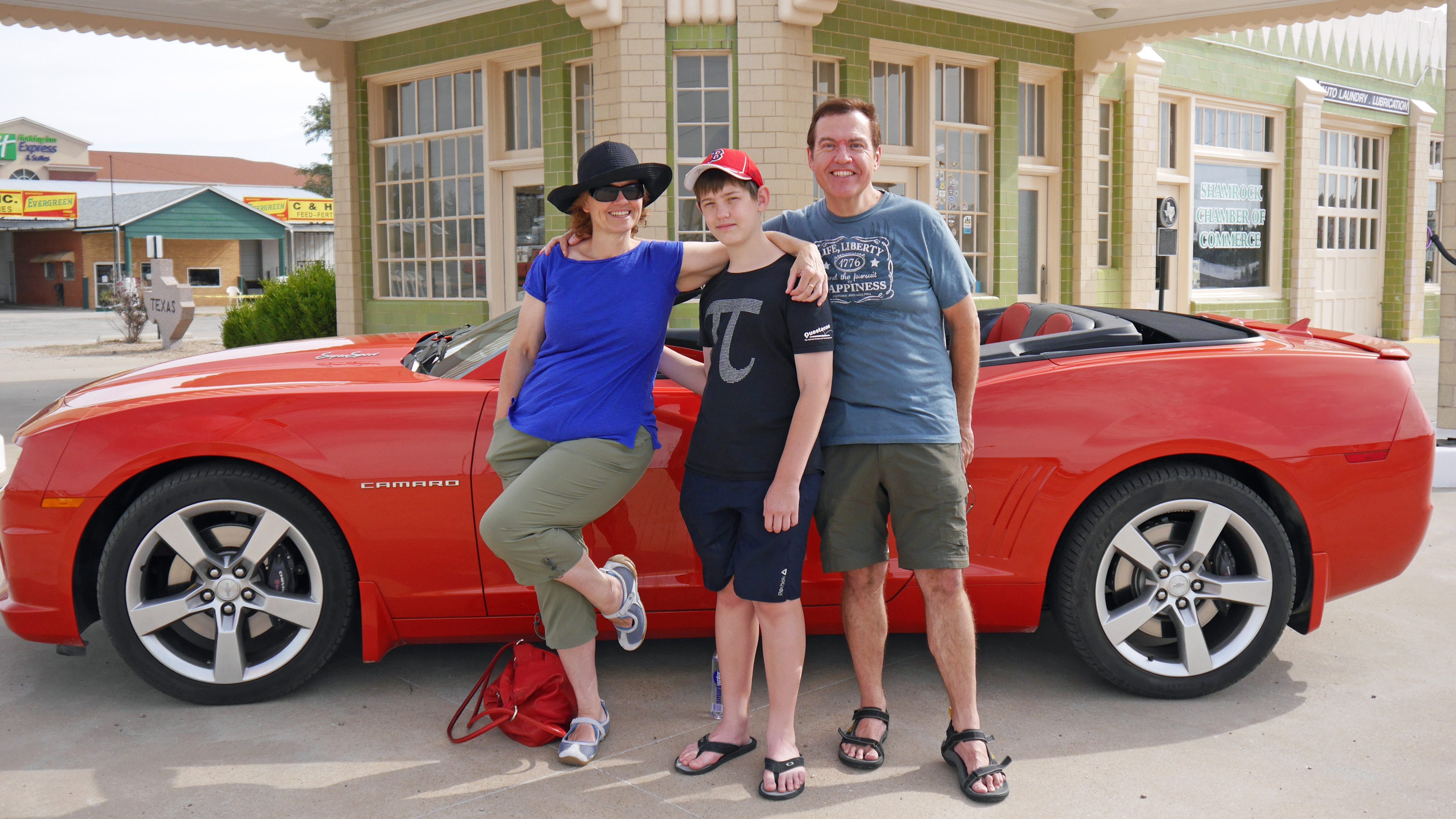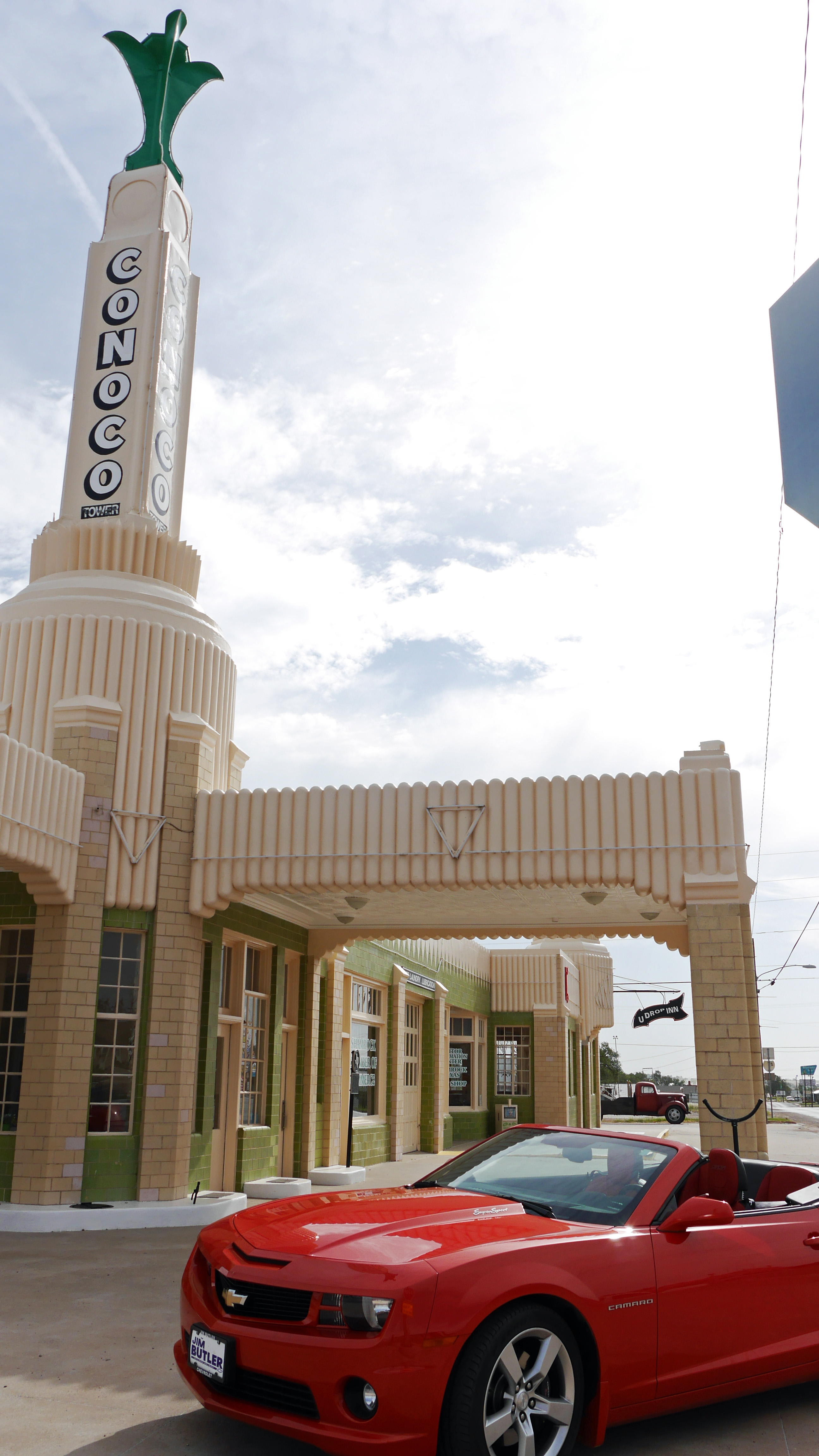 We had our picture taken by the owner of the sexy red Camaro (no, it’s not Lightning McQueen from Cars) who we struck up a chat with.  She grew up in Shamrock but had moved to Oklahoma but was returning home to visit her family.   When she offered to take our picture, we insisted that it be in front of the new Camaro.