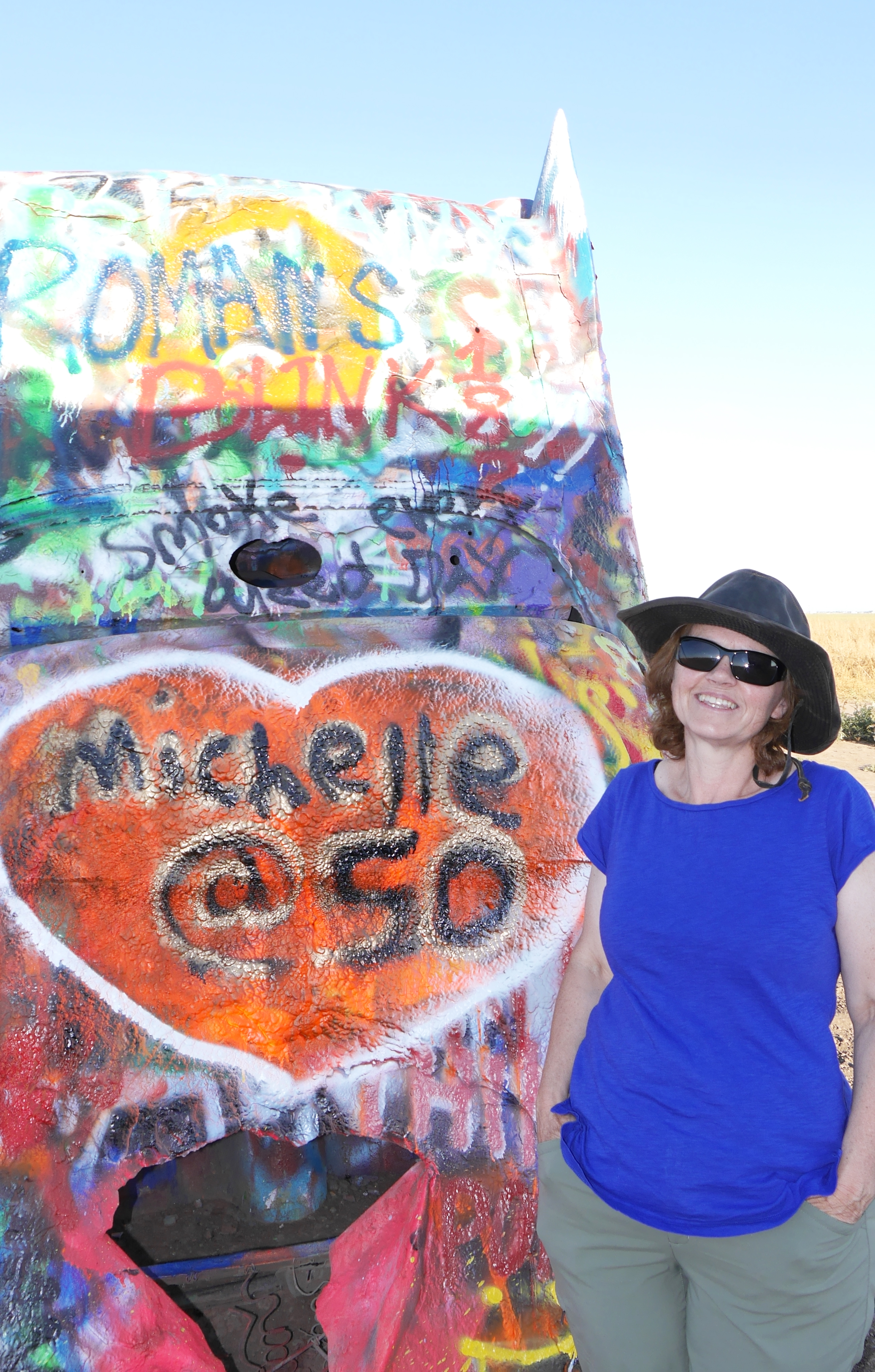 As Michelle’s 50th birthday was looming, we decided to leave our mark at Cadillac Ranch just outside of Amarillo and also at its less well-known cousin, the VW Ranch in Conway. These are both fields of upended cars that people graffiti. We is people, so we did the same; the results of which you can see below.